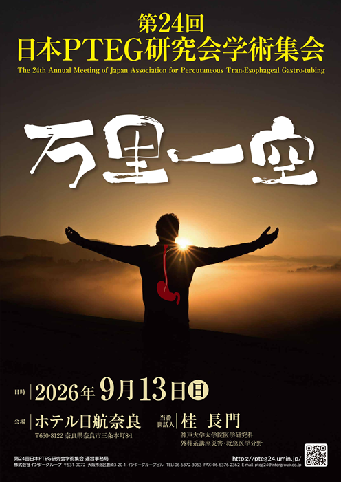 当研究会は経皮経食道胃管挿入術(Percutaneous Trans-Esophageal Gastro-tubing; PTEG)に関する研究を行い、PTEGを用いた治療の安全性および簡便性を向上させると共に、より多領域への応用および発展を目的としています。